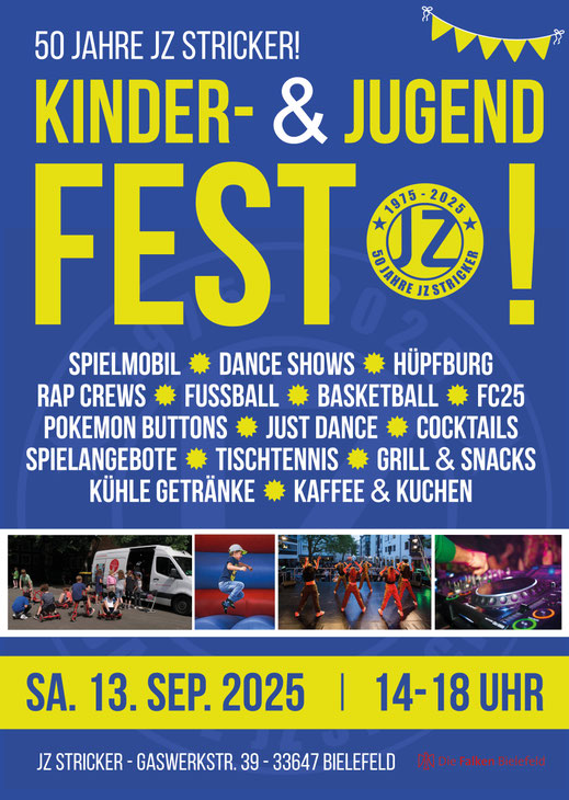 Am 13. September feiern wir dieses Jubiläum mit einem Kinder- und Jugendfest als Tag der offenen Tür – nicht nur im Jugendzentrum, sondern auch direkt davor. Dafür haben wir eigens eine Straßensperre beantragt, um das Außengelände der Gaswerkstraße für eine Hüpfburg und ein Spielmobil nutzen zu können. Im gesamten Haus wird es eine Vielzahl kostenfreier Bastel-, Sport- und Spielangebote geben, z. B. ein Fußballturnier, ein Freiwurfturnier im Basketball, Tischtennis-Rundlauf, ein PS5-F25-Turnier, Just Dance, Bewegungsspiele und Pokemon-Buttons. Für das leibliche Wohl wird mit Kaffee und Kuchen, Waffeln, kühlen Getränken und alkoholfreien Cocktails sowie Snack- und Grillangeboten gesorgt. Im Veranstaltungsraum des JZ Strickers wird es für Jugendliche ein buntes Programm mit diversen Dance-Shows, Rap-Auftritten und cooler Musik geben. Die offizielle Eröffnung des Kinder- und Jugendfestes sowie diverse Ansprachen finden ebenfalls um 14:30 Uhr dort statt. Wann? Samstag, 13.09.2025 von 14 bis 18 Uhr!